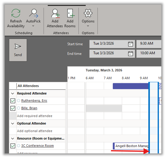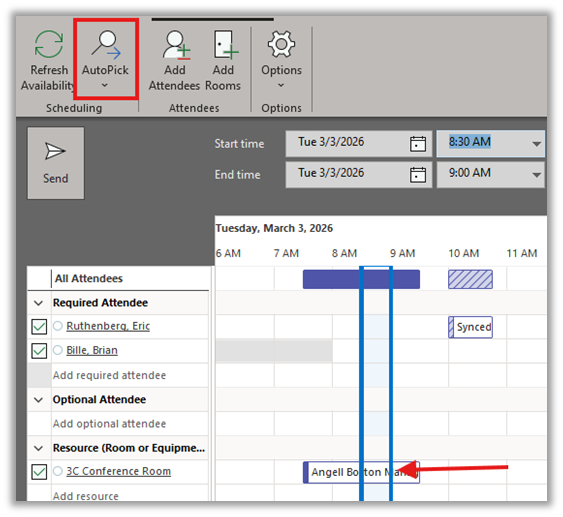 In the Scheduling Assistant window, you will see everyone’s availability, including the room you chose. If someone has something booked during the time you entered, use the “Auto Pick” button to ask Outlook to look for the next available time everyone is free, or simply click in the window where you see everyone is available.